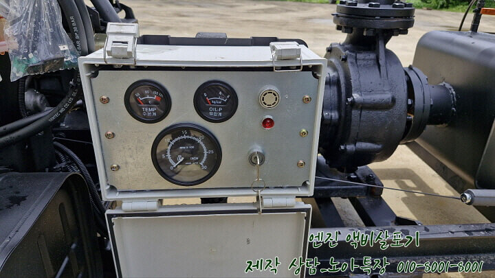컨트롤 박스를 장착하여 키를 이용해 시동을 켜고 끌수 있도록 하였습니다. 작동 원리는 이렇습니다. 엔진을 이용해 액비펌프를 돌려서 탱크로리와 연결된 호스를 통해 트랙터 쪽으로 밀어주게 됩니다. 이 원리를 이용해 포를 장착하여 쏠 수도 있습니다.